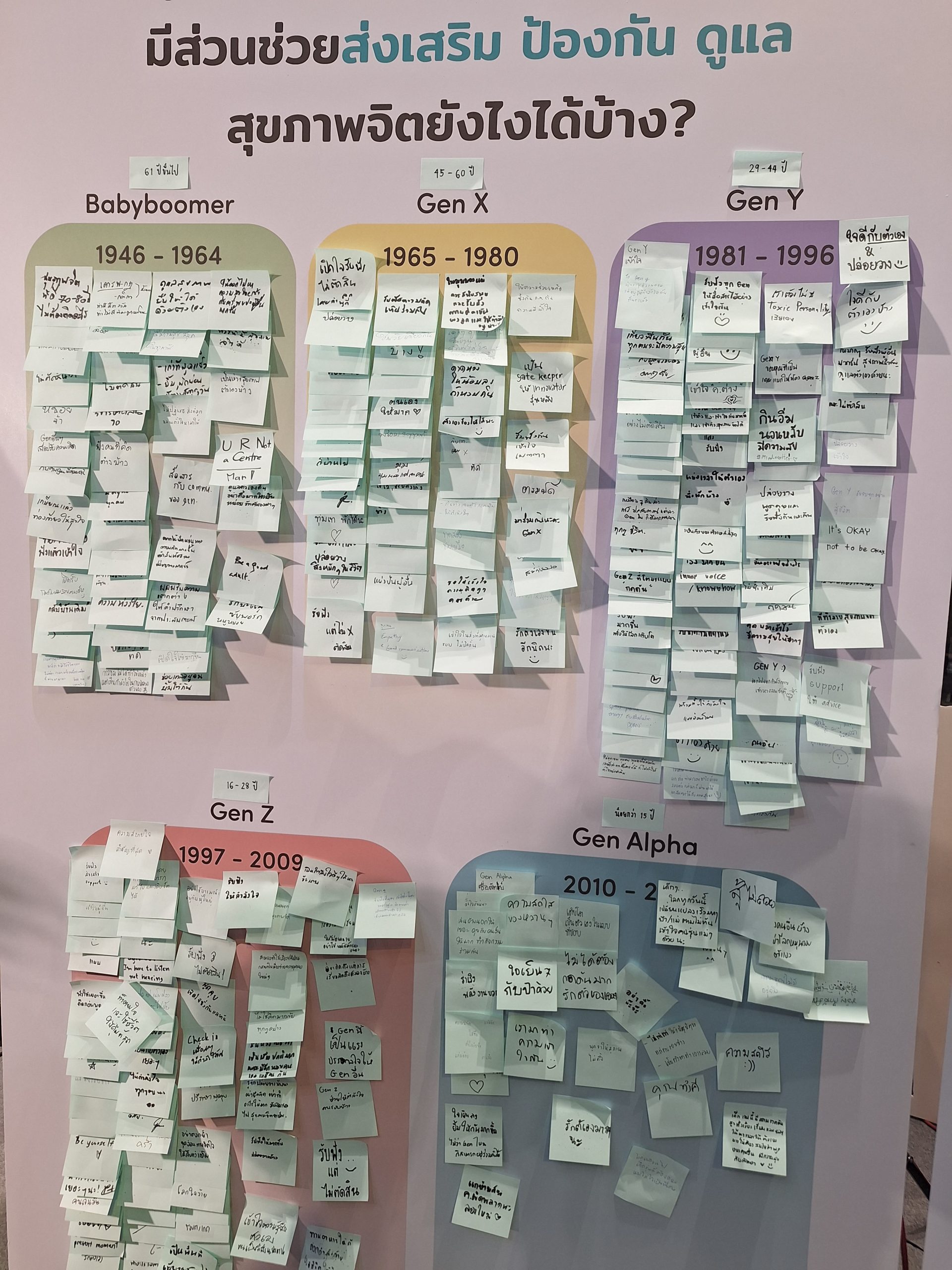 จากกิจกรรมนี้สะท้อนให้เห็นได้ว่า ถึงแม้มุมมองความคิดเห็นที่มีต่อคนแต่ละ Generation จะแตกต่างกันไป ทว่าผู้เข้าร่วมกิจกรรมกลับมีประเด็นที่น่าสนใจร่วมกัน ได้แก่ การรับฟังอย่างเข้าอกเข้าใจ การไม่ตัดสิน การใจดีกับตนเอง การรู้จักดูแลใจของตนเองก่อน รวมไปถึงการส่งต่อพลังบวกและการช่วยเหลือผู้อื่น ดังนั้น สิ่งสำคัญที่ไม่ว่าเราจะอยู่ใน Gen ไหน “การรับฟังอย่างเข้าใจ การรักตัวเอง และการส่งต่อพลังบวก” คือจุดร่วมที่มนุษย์ทุกช่วงวัยสามารถช่วยสร้างเสริมสุขภาพจิตและสุขภาวะทางจิตให้กับผู้คนในสังคมได้