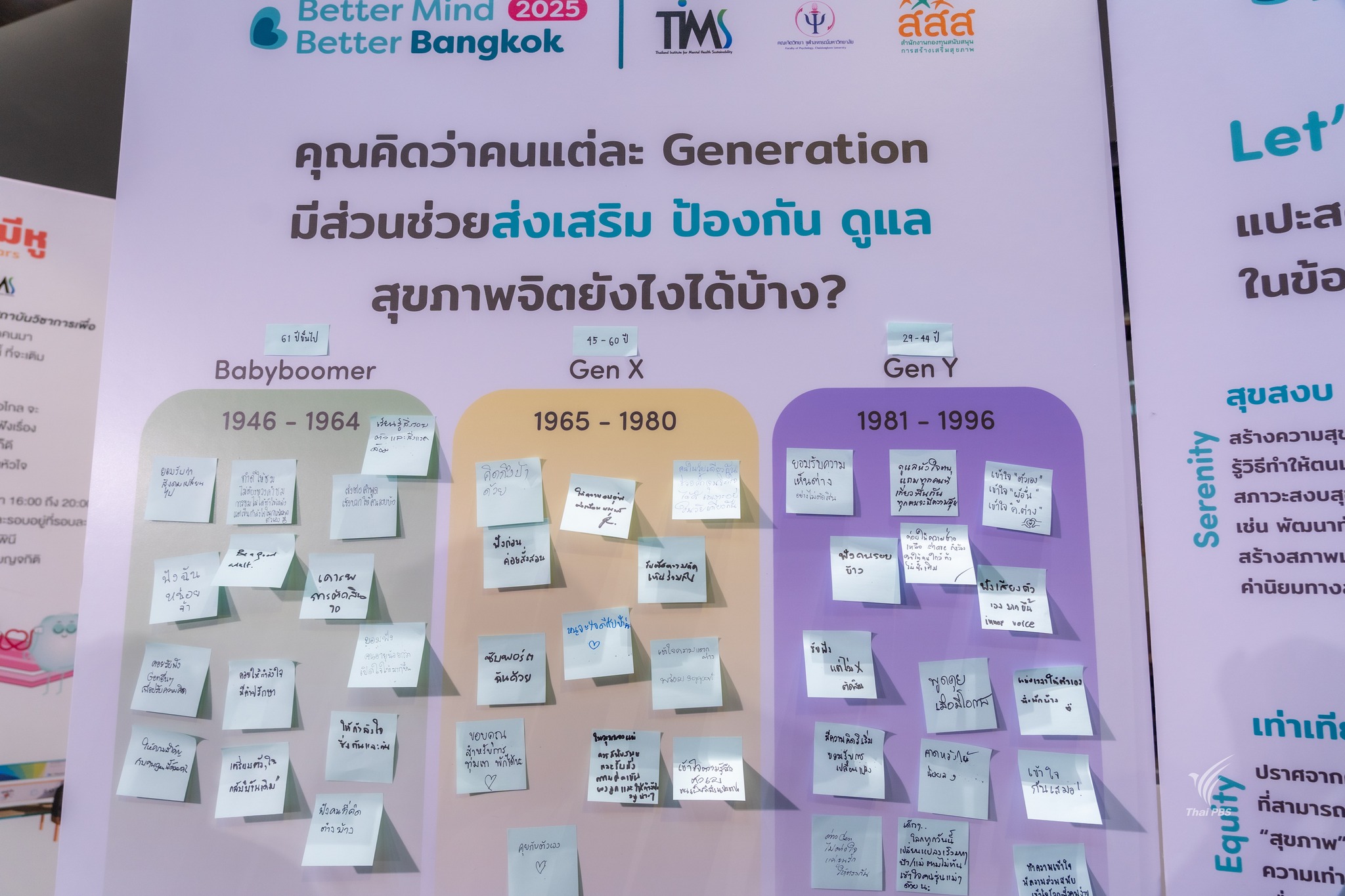 ในปีนี้ สถาบันวิชาการเพื่อความยั่งยืนทางสุขภาพจิต (TIMS) ชวนทุกคนมาจุดประกายความหวังให้กับสังคม เพราะเราเชื่อว่า “คนทุกวัยสามารถเป็นส่วนหนึ่งในการขับเคลื่อนอนาคตของสุขภาพจิตที่ดีขึ้นไปด้วยกันได้” เราจึงจัดกิจกรรมที่เปิดโอกาสให้ทุกคนมาร่วมแลกเปลี่ยนมุมมองเกี่ยวกับบทบาทของคนแต่ละ Generation ที่มีต่อการเปลี่ยนแปลงและป้องกันปัญหาสุขภาพจิตด้วยการเขียน Post-it แสดงความคิดเห็นว่า ”คนแต่ละ Generation มีส่วนช่วยส่งเสริม ป้องกัน และดูแลสุขภาพจิตอย่างไรได้บ้าง?”