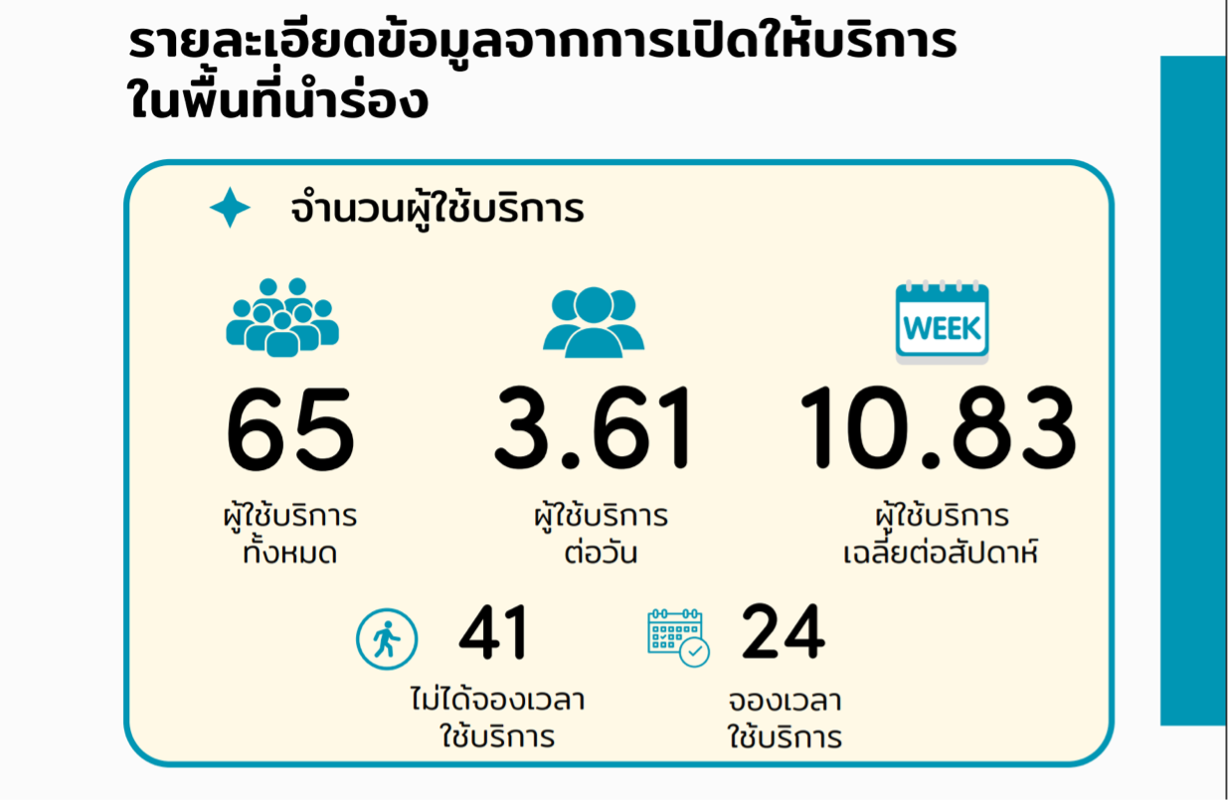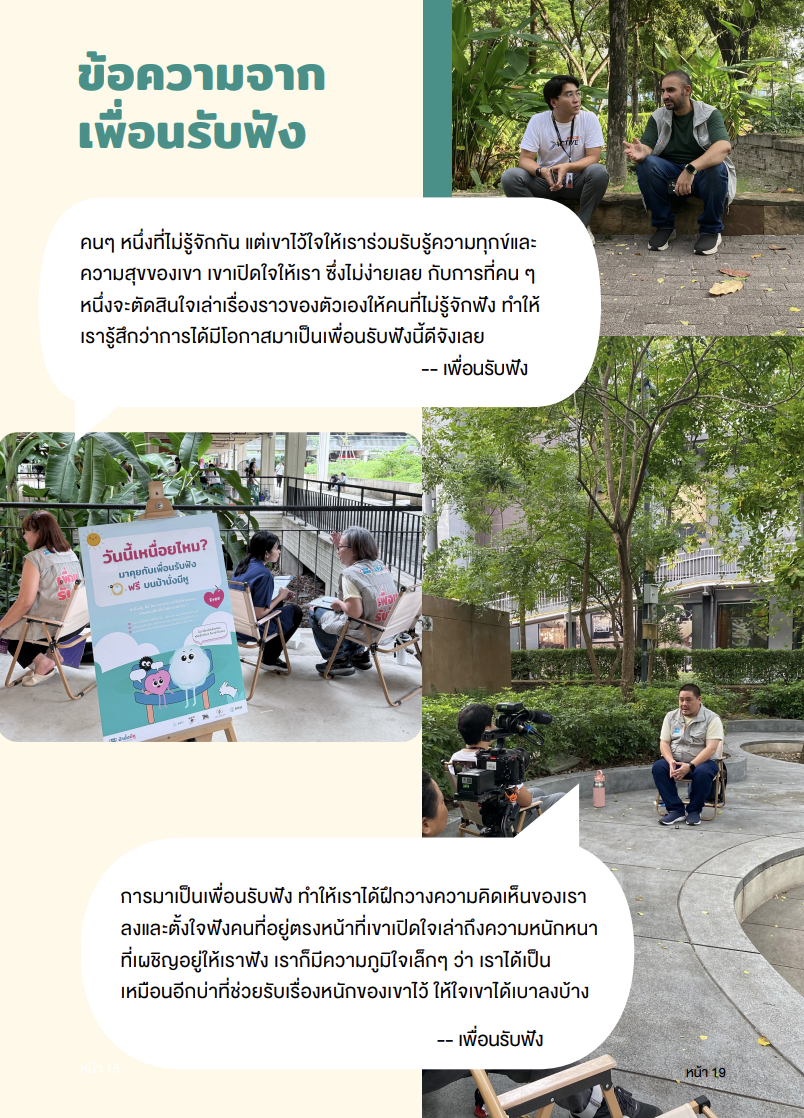 ตลอดระยะเวลา 6 สัปดาห์ที่โครงการเปิดให้บริการในสวนสาธารณะช่วงเวลา 16.00-20.00 น. ของวันจันทร์ วันพุธ วันศุกร์ และวันเสาร์ เวลาให้บริการรอบละ 40 นาที รวมถึงการทดลองเปิดให้บริการในงานนิทรรศการกรุงเทพมหานคร BKK Expo 2025 ช่วงเวลา 12.00-20.00 น. ทำให้ได้เห็นถึงปฏิสัมพันธ์ที่เต็มเปี่ยมไปด้วยการสนับสนุนระหว่างเพื่อนรับฟังที่ผ่านการอบรมและประชาชนทั่วไปที่เข้ามาใช้บริการ สะท้อนว่าเมื่อบริการเชิงสุขภาพจิตได้เข้ามามีบทบาทในพื้นที่ชุมชน สามารถช่วยลดอุปสรรคในการเข้าถึงการสนับสนุนด้านสุขภาพจิตขั้นพื้นฐาน ขณะเดียวกันก็สร้างพื้นที่แห่งความเข้าใจ ความเมตตา และการเรียนรู้ด้านสุขภาพจิตให้เกิดขึ้นในสังคมมากขึ้นได้